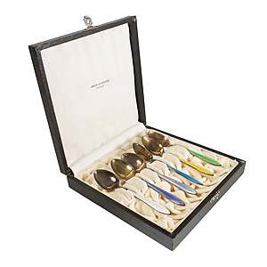 6 spoons, D. ANDERSEN, SILVER 925/000 with remnants of gilding, signed, D-A NORWAY STERLING (DAVID ANDERSEN), spoon and handle colorfully translucent enameled, engine-turned, l = 97.5 mm, enamel partly with small flaws. Rare to find with original box !