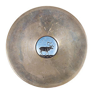 Teller, SILBER 830/000, signiert T im Wappenschild (Turm A/S Kormerup um 1972 Dänemark) im Boden eine emaillierte Platte mit einem ELCH (leicht relieffiert), im Hintergrund die Berge unter dem Sternenhimmel, D = 21,0 cm, total 208 g