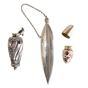 Lot: 3 antike Flacons, SILBER, 1 Flacon für Schnupftaback ? Umlaufend reliefiert mit Blumenmotiv, H = 65,5 mm; 1 glattes Parfumflacon mit Sicherheitskettchen H = 107,5 mm; 1 Parfumflacon, Porzellan bemalt, Metall mit alter Vergoldung (berieben)