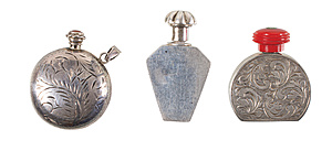 Lot: 3 antique flacons, SILVER, 1 flacon for snuff ? with floral motif in relief all around, h = 65.5 mm; 1 smooth perfume flacon with safety chain, h = 107.5 mm; 1 perfume flacon, painted porcelain, metal with old gilding (rubbed)