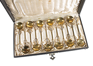 12 small spoons, SILVER 800/000 gilt (rubbed), signed, small winged putti head at the end, style ornamented on both sides, l = 116.0 mm, with original box !