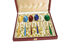 6 Löffel, D. ANDERSEN, SILBER 925/000 mit Resten von Vergoldung, signiert, D-A NORWAY STERLING (DAVID ANDERSEN), Laffel und Griff farbenfroh transluzied emailliert, guillochiert, L = 97,5 mm, Emaille teilweise mit kl. Fehlstellen. Mit Originalschatulle selten zu finden !