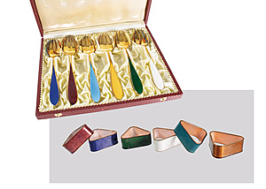 Dessertbesteck, 6 Gabeln u. 6 Löffel, VINTAGE 1940/50er Jahre, SILBER 925/000 vergoldet, signiert T im Wappenschild 925S, (Dänemark ?), Laffel und Griff farbenfroh transluzied emailliert, guillochiert, L = 139,0-140,0 mm, mit Originalschatulle ! Blaue Gabel mit winziger Fehlstelle. Dazu 6 Serviettenringe in Dreiecksform, Kupfer transluzid emailliert mit Konteremaille.