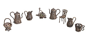 Lot of MINIATURES, SILVER, 4 jugs; 2 baskets; 1 chair and 1 cup, fine corded wires form these filigree objects, h = 10.4 - 22.2 mm