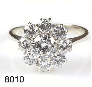 Klassischer Brillantring, WG 750/000, 1 Brillant ca. 0,8 ct, weiß/ P1, 8 Brillanten gesamt ca. 1,2 ct, weiß/P1, RW ca. 57, Preis laut Schmuckpass € 3900,-
