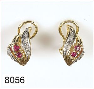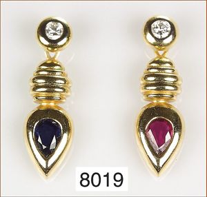 1 Paar Ohrhänger, GG 750/000, Brillanten 0,25 ct, feines Weiß/ lupenrein, 1 Rubintropfen 0,52 ct, 1 Saphirtropfen 0,86 ct (beide feine Qualität), Hängeteile abnehmbar, Brillantstecker einzeln zu tragen