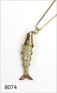 Anhänger, Fisch mit beweglichen Gliedern, GG 585/000 und Kette, GG 333/000, ca. 40 cm