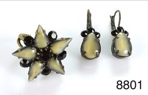 Konvolut Modeschmuck, 1 Ring, 1 Paar Ohrhänger, Metall mit Glasperlen