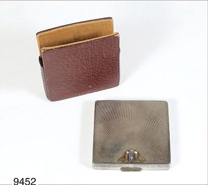 Puderdose,BLACK,STAR & GORHAM STERLING 14 k (gepunzt), Amerikanisches Art-Deco,14 k Goldverziehrung mit 3 Princess Saphieren,original Lederetuit, ca 80 g