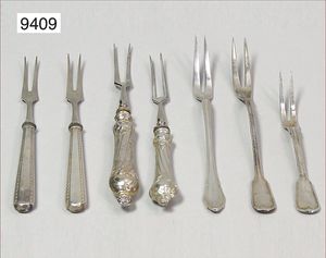 7 gemischte Fleischgabeln, Silber 800/000 ( 4 mit Metallzinken und kitgefüllt ), gesamt ca. 244 g