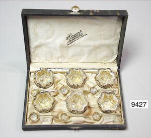 6 Salzfässer und 6 Löffelchen, Silber 800/000, Fa. Posens Frankfurt/Main & Berlin, original Schatulle , sammelwürdig!