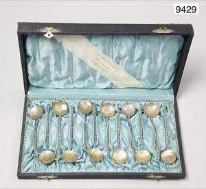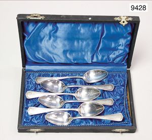 6 Jugendstil Kaffeelöffel, mit Zahl 12 gestempelt, um 1900, mit Besteckkasten