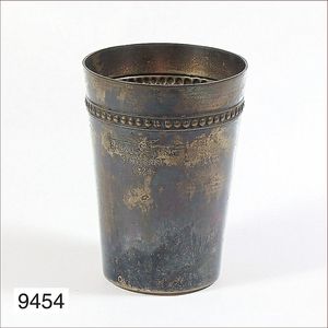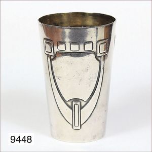 Versilberter Becher, BAUHAUS, von Architektenwettbewerb zur Bauausstellung Weißenhof-Siedlung 1924, Gravur auf Becher:BAUAUSTELLUNG STUTTGART 1924