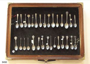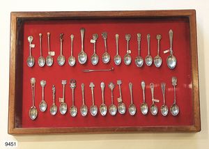 Sammlung alter englischer Kaffeelöffel aus Sterlingsilber mit Golfmotiven, insg. 29 Stück und eine Gabel, erste Hälfte 20 Jhdt., mit englischer Glasvitrine Mahaghoni