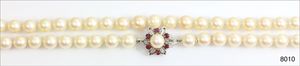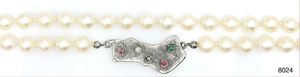 Perlenkette, WG 750/000, indiv. gearbeitete Schließe in Schweißtechnik, 1 Brillant 0,04 ct tw-si, 1 Saphir, 1 Smaragd, 2 Rubine (alle facettiert), Akoja-Perlen mit sehr schönem Lüster, D = ca. 7,0 mm, ca. Länge 57,5 cm