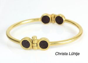 Armreif, CHRISTA LÜHTJE, München, GG 900/000, mit 4 runden Rubin-Platten, dazwischen liegen die Bewegung und die Schließe, Innenmaß ca. 63 x 59 mm, total 42,5 g