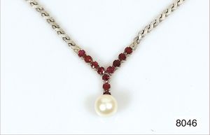 Akoja-Perlenkette, WG 585/000, Schließe mit 6 Rubinen, 1 Akoja-Perle, Länge ca. 68,5 cm, D = 7,5 - 7,8 mm