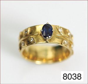 Ring, GG 22 k, 1 Saphir-Rechteck ca. 2 ct, 2 Saphir-Dreiecke ca. 9 x 9 x 9,5 mm, 18 Diamanten ca. 0,20 ct weiß, RW ca. 62