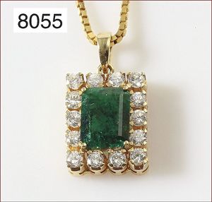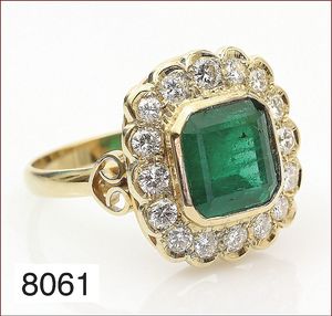 Ring, GG 585/000, Smaragdachteck ca. 4,0 ct dkl. grün, 16 Brillanten ca. 0,88 ct tw/w-vsi, RW ca. 60