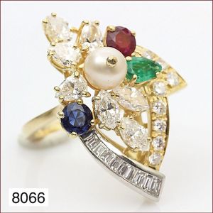 Ring, reicher Diamantbesatz, GG 22 k, 8 Brillanten ca. 0,24 ct, 3 Marquise ca. 0,92 ct, 4 Diamant Tropfen ca, 1,16 ct, 9 Baguettes ca. 0,30 ct, 1 Rubin ca. 0,50 ct, 1 Smaragd-Tropfen ca. 0,40 ct, 1 Saphir 0,6 ct, 1 Perle D = 6,1 mm, Brillanten & Diamanten ca. weiß/get.weiß-vsi/si, total ca. 2,62 ct