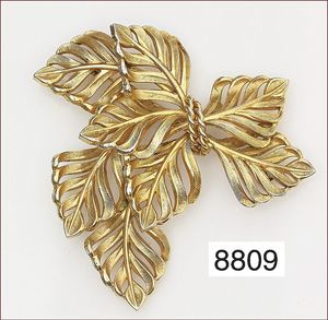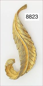 Große, längliche brosche in Form eines Blattes, signiert Kramer (USA), 60er Jahre, mattes goldfarbenes Metall, plastische Ausführung