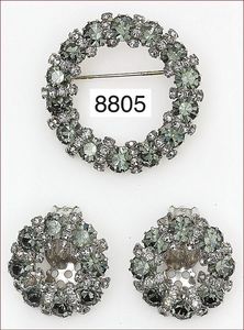 Set von WEISS, USA (signiert), 50er Jahre, kringelförmige Brosche und Ohrclips, Strassbesatz in dunklem grau-blau und kleineren klaren Steinchen, Brosche: D = 37 mm, Clip: D = 23 mm