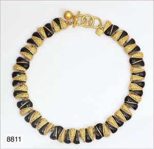 Goldfarbenes Collier von Anne Klein (signiert auf dem Anhänger am Verschluß), gemusterte Kettenelemente mit schwarzen Emaille-Einlagen, Knebelverschluß, L = 46 cm