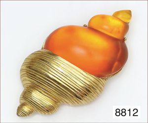 Große, massive Designerbrosche von Dior um 1970, karneolfarbiger Kunststein, goldfarbenes Metall in Form einer großen Muschel, im Originalkarton, 98 x 51,5 mm