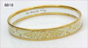 Schmaler Armreif von Michaela Frey ( signiert), goldverzierte, cremefarbene Emaille-Auflage, verg, Fassung, innen D = 62 mm