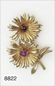 Zierliche Blütenbrosche von Grosse (Henkel & Grosse, Pforzheim), signiert mit der Jahreszahl 1965, 2 Blüten mit jeweils einem mittigen violetten Glascabochon, L = 46 mm