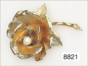 Goldfarbene Brosche von BOUCHER (USA), signiert mit Patentnummer, 50/60er Jahre, in Form einer Rose mit Kunstperle, H = 49 mm