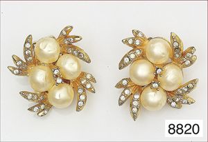 Goldfarbene Ohrclips von Hattie Carnegie (signiert Carnegie), USA, je 4 Barockperlen, florales Designe, zierliche Blätter mit winzigen klaren Strasssteinchen, D = 28 mm