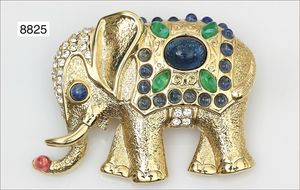 Figürliche Brosche von Grossse (Henkel & Grosse, Pforzheim), in Form eines Elefanten, besetzt mit klaren Strasssteinen und farbigen Glascabochons, in Blau-und Grüntönen, 54,5 x 41,5 mm