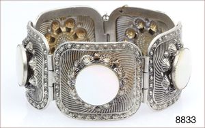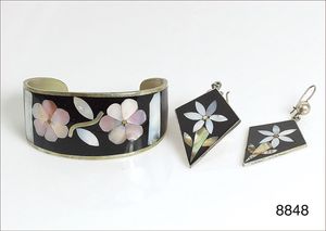Lot: 2 Teile Modeschmuck, Metall, Perlmut-Einlage, schwarzer Kunstoff, Mexico 80iger Jahre, 1 Armspange (Metall), 1 Ohrhänger (Silber), Höhe ca. 60 mm