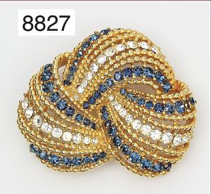 Große Brosche von BOUCHER (USA), signiert mit Patentnummer, 60er Jahre, reich besetzt mit kleinen klaren und blauen Strasssteinen, Knotenform, 47 x 44 mm