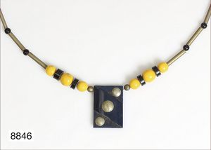 Kette, ART DECO, Metall, Kunstoff, gelbe Kugeln, schwarze Zylinder u. Kugeln, Mittelteil bläulich mit Metalleinlagen, ca 43,0 cm, auf Metallkette gefädelt