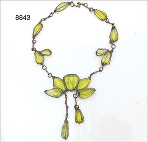 Grüne Glas-Kette mit feinem Draht umwickelt, dekoratives Mittelteil, Avantgardeschmuck der 20er Jahre, Originalzustand, ca. 46 cm