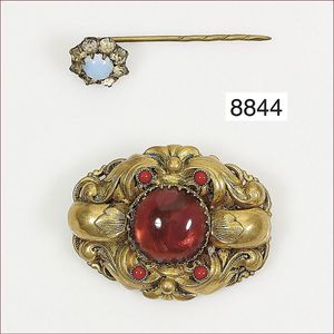 Lot: 20er Jahre, Nadel: Metall, Glas (Opalglas mit weißem Kranz),ca. 39 mm, Brosche: Metall vergoldet, Glas, lila Cab. mit roten Korallimitat, ca. 39 x 30 mm