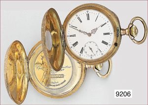 Damentaschenuhr, Half Hunter um 1910, glattes Gehäuse GG 750/000, sehr gut erhaltenes E.Z. Blatt mit röm. Zahlen und gebl. Zeigern, geschnittene Kompensations-Unruhe u. Breguetspirale, Emaille im Deckel in perfektem Zustand, D = 35,5 mm, läuft an, Reinig. bed.