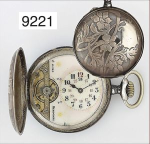 Herren Zylindertaschenuhr, HEBDOMAS, JUGENDSTIL, Silber 800/000, Gehäuse mit schön gravierten Blumenmotiven, außen kl.Dellen, E.Z.Blatt mit Gold verziert (kl. Abplatzer), arab.Zahlen, Std.Anzeige dezentral, 8-Tagewerk, Ankerhemmung, Brequetspirale sichtbar, D = 50 mm, Uhr läuft nicht, Feder u.Welle defekt