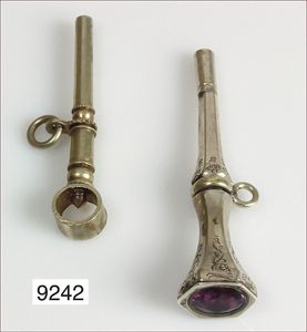 Lot: 2 Taschenuhrenschlüssel, 1 x Metall,1 x Silber graviert, mit lila Schmuckstein