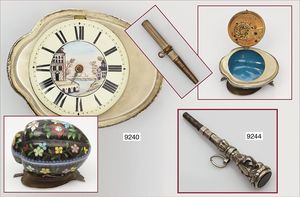 Spindeltaschenuhr, sig. S. TANNER, CLIFFE LEWES 49619 Anfang 19.Jhd., Uhr in silbernem, mit farbigen Blumenmotiven verziertes Emaillegehäuse eingearbeitet, E.Z.Blatt mit Häuserszene und Fluß, röm. Zahlen, feuervergoldetes Vollplatinenwerk mit filigran gearbeiteter Spindelbrücke, Std. Zeiger fehlt, 1 Schlüssel, D = 48,5 mm, Uhr läuft nicht ab