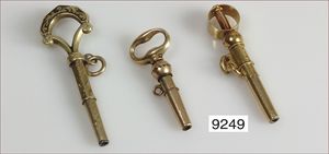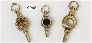 Lot: 3 Gold-Taschenuhrenschlüssel, 1 x 333/000 mit Schmuckstein L = 48 mm, 1 x 585/000 mit 2 Schmucksteinen, 1 x 750/000