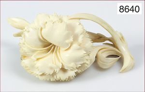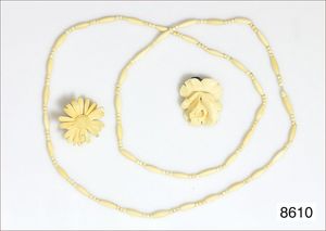 Lot: 1 x antike Elfenbein-Kette, Drehschloß, L = 67,5 cm, 1 x Anhänger Erbacher-Rose, H = 30mm; 1 x Bein-Brosche, Margerite, D = 27,5 mm (Kugelhaken fehlt), um 1900-20er Jahre