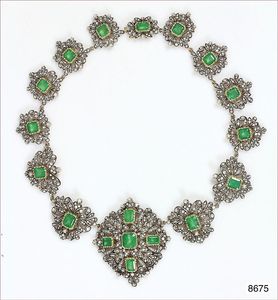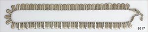 Trachtenschmuck-Uhrenkette, BIEDERMEIER-CHATELAINE um 1860/70, Süddeutsch, Silber, Mittelteil mit zwei Schiebern und bemalten Glascabochons (beweglich), coloriert, seitlich eine Troddel, an den Enden ein Karabiner u. ein Federring, L = 32,5 cm, orig. Silberpunze