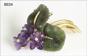 Brosche, 50er Jahre, GG 585/000, gravierte Blüten u. Blätter, Amethyst u. Jade, 3 Diamanten weiß, Schiebesicherung, L = 47,0 mm