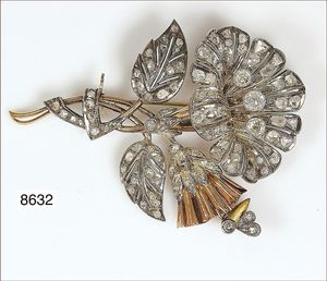 Brosche, ART DECO 30er Jahre, Blume mit reichem Diamantbesatz, RG 585/000, Steine in Ag gefaßt, 3 zentrale Altschliffdiamanten ca.1 ct weiß/getö.weiß-si/p, ca 89 Diamantrosen, Rückseite alte Reparaturstellen, ca. 53 x 78 mm