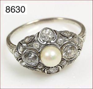 Ring, ART DECO aus den 20er Jahren, WG 585/000, Akoja-Perle, D = 5,3 mm, 4 Altschliffdiamanten, ca. 0,75 ct w-si/p, 14 Diamantrosen, RW ca.60