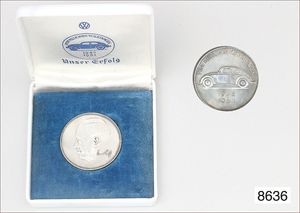 Volkswagen Jubiläumsmünze in Originalschatulle, Silber 1000/000, Vorderseite fünf Millionen Volkswagen 1945- 1961, RV: Seitenansicht von VW Chef Heinrich Nordhoff, ca. D = 40,0 mm