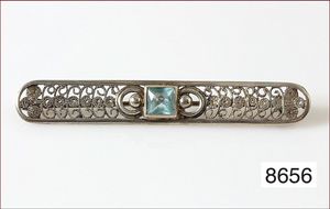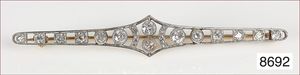 Brosche, ART-DECO 20er Jahren wohl deutsch, GG 750/000, 1 Altschliff-Diamanten ca. 0,12 ct w si/p, 7 Diamantrosen, zwei feine Linien mit bl. Saphiren in Platin ausgefasst, L =44,5 mm